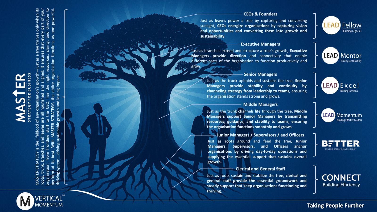 At Vertical Momentum, we believe that organisations, like trees, only thrive when every part is strong, aligned, and nourished. The roots—your clerical staff, frontline teams, supervisors, officers, and junior managers—anchor the organisation, drawing in the energy and resources that keep daily operations alive. The trunk—your middle and senior managers—provides the strength, stability, and channels through which vision is carried upward and execution flows downward. The branches—your executives and directors—spread wide, shaping direction, creating opportunities, and extending the organisation’s reach into new markets and impact. Finally, the leaves—your CEO—capture and transform the external environment into growth, renewal, and life for the entire system.